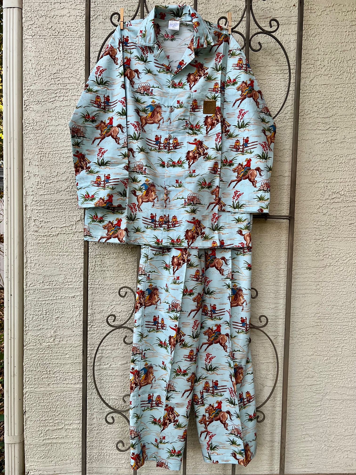 Information: Cowboy Pajamas Matching Pajama Top 100% comfortable quality cotton Cowboy Pajamas custom made buttons, Straight hem, long-sleeved with chest pocket and Cowboy Pajamas emblem patch on pocket Made in Texas |